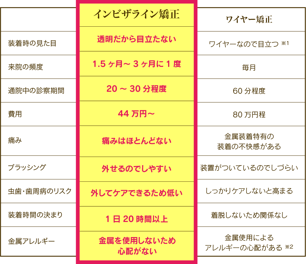 インビザライン矯正は、ワイヤー矯正に比べて一度に動かす歯の距離が短く、少しずつ細かく動かしていくため歯に与える負担が軽く痛みも少なく済みます。また、ワイヤー矯正のように歯の表面にワイヤーやブラケットを装着しないため、唇や口腔中の粘膜などを傷つけるリスクが低いです。 -